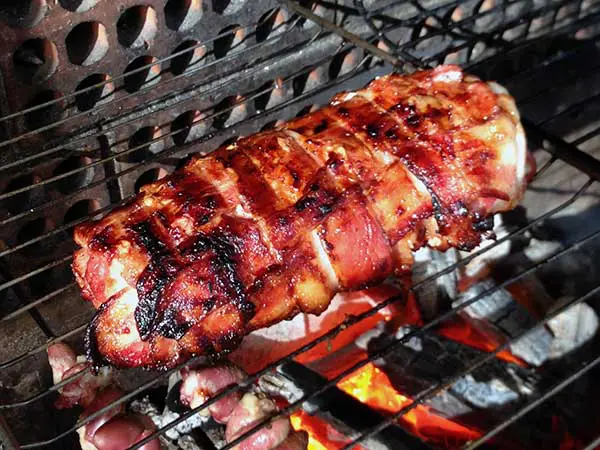 Levamos o rolo de trança de bacon à grelha (alta) e deixamos por 45 minutos (virando uma vez com 30 minutos).